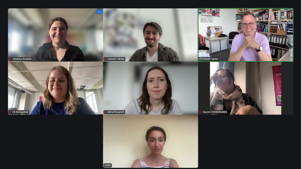 Vivian Perkovic (unten), Prof. Dr. Christoph Jacke (oben rechts) und die Seminarteilnehmenden