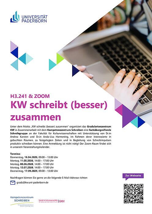 Under the motto "KW writes (better) together", the Graduate Centre of the Faculty of Arts and Humanities (GKW) and the Writing Competence Centre organise a monthly interdisciplinary writing group. The meeting on Thursday, 16 April, will take place from 9 am to 1 pm in room H3.241 and hybrid via Zoom. Registration is not required.
