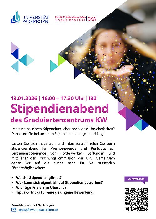 Doctoral students and postdocs who are interested in a scholarship but are still unsure about the details can find out more at the scholarship evening organised by the Graduate Centre of the Faculty of Arts and Humanities on Tuesday, 13 January. The event will take place from 4 to 5.30 pm at the International Meeting Centre (IBZ) in the Jenny Aloni House. Please register by sending an email to gradz@kw.uni-paderborn.de.