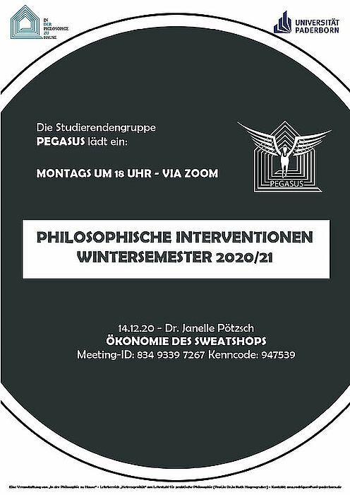 „Pegasus“, die Studierendengruppe des Projekts „In der Philosophie zu Hause“, lädt am 14. Dezember zur zweiten „philosophischen Intervention“ im Wintersemester ein. Die Veranstaltung startet um 18 Uhr auf Zoom. Dr. Janelle Pötzsch von der Uni Paderborn spricht zum Thema „Ökonomie des Sweatshops“. Nach einem kurzen provokativen Impulsvortrag sind alle eingeladen, mitzudiskutieren.
