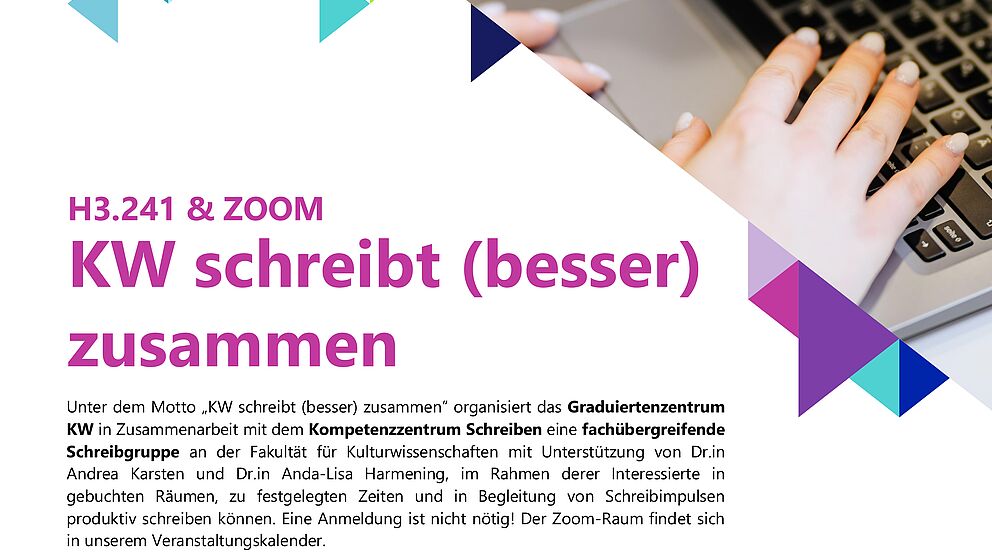 Under the motto "KW writes (better) together", the Graduate Centre of the Faculty of Arts and Humanities (GKW) and the Writing Competence Centre organise a monthly interdisciplinary writing group. The meeting on Monday, 11 May, will take place from 2 to 5 p.m. in room H3.241 and hybrid via Zoom.