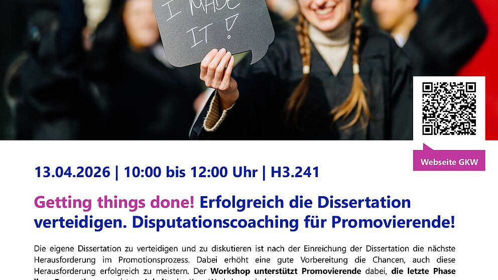 To support doctoral candidates in mastering the final phase of their doctorate, the Graduate Centre of the Faculty of Arts and Humanities is offering the workshop "Getting things done! Successfully defending your doctoral dissertation".