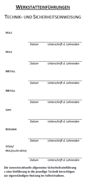 An der allgemeinen Sicherheitseinführung muss jedes Semester teilgenommen werden. Die Teilnahme wird im Ausweis mit einer Unterschrift und einem Stempel bestätigt. Die Einführung findet im Rahmen der Bildhauerei-Seminare in den ersten beiden Semesterwochen statt. Seminarunabhängige Termine werden von Herrn Boscarato per Aushang bekanntgegeben.