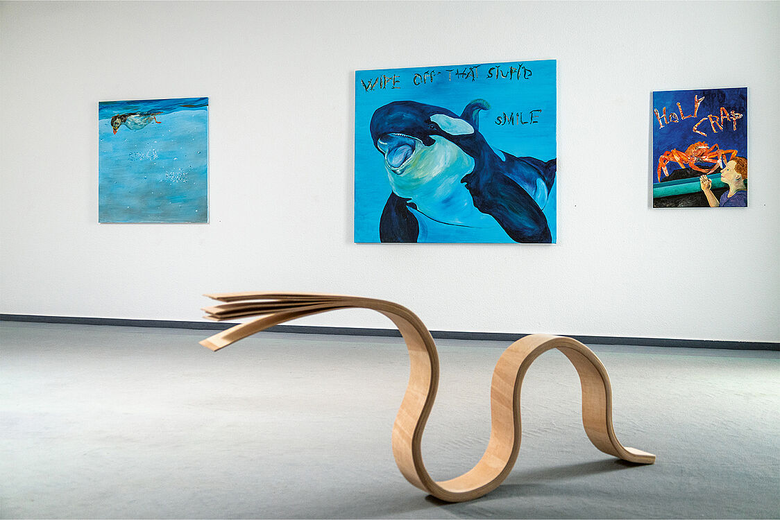 Eine thematische Verbindung über Gattungsgrenzen hinweg stellt die Auseinandersetzung mit der Rolle von Wasser – als Motiv, als Medium oder in seinen verschiedenen Aggregatzuständen – dar. Dabei werden aktuelle gesellschaftliche Fragestellungen sowohl in der malerischen als auch der bildhauerischen Arbeit in den Blick genommen: Wasser als Grundlage allen Lebens und als Bedrohung für Leib und Leben angesichts von Extremwettereignissen bedingt durch den Klimawandel. Ein Dreh- und Angelpunkt sowohl in der künstlerischen Arbeit als auch in der wissenschaftlichen Reflexion ist das Fragen nach der Relation zwischen neuen und traditionellen Ausdrucksformen. In der Druckgrafik wird deutlich, dass traditionelle Techniken wie der Holzschnitt und die Kaltnadelradierung auch in der zeitgenössischen Kunst noch eine wichtige Rolle spielen, dass aber auch neue künstlerische Praktiken wie das „Sticker bombing“ hinzutreten. Der Siebdruck wird als Medium zur Gestaltung von Aufklebern genutzt, mit denen Botschaften schnell und überall verbreitet werden können.