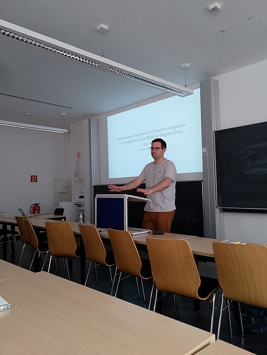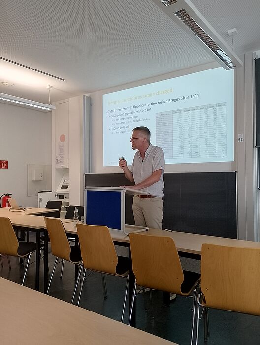 Auch im Sommersemester 2025 wurde die Vortragsreihe des IEMAN – Institut für die Erforschung des Mittelalters und dessen Nachwirkung – fortgesetzt. Dieses Semester gab es sogar zwei internationale Referate. Am 17. Juni referierte Dr. Milan Pajic der Universität Straßburg in Paderborn und am 1. Juli Prof. Dr. Tim Soens der Universität Antwerpen. Beide Referenten fanden auf Einladung des Arbeitsbereichs Geschichte Flanderns in europäischer und globaler Verflechtung ihren Weg zur Pader, um eher ungewohnte (aber dafür umso spannendere) Aspekte des Mittelalters, nämlich die lokale Bewältigung von Immigration und den epochenüberschreitenden Umgang mit Naturgewalt, vorzustellen. Dr. Pajic ist seit seiner Publikation bei der angesehenen Cambridge University Press über die Migration flämischer Tuchwerker nach England im späten 14. Jahrhundert eine Autorität für die Erforschung der Migrationspolitik unter dem englischen König Edward III. und die Gründe für Migration zwischen England und den “Low Countries”. In seinem Vortrag “Institutions and Strangers in English Towns (1300-1500)” ging er mehr auf den Umgang mit unterschiedlichen Migrantengruppen in englischen Dörfern und Städten ein, mit besonderem Augenmerk auf der Frage, ob die überlieferte episodische Gewaltausbrüche gegen Migranten auf “Xenofobie” oder eher auf andere Gründe wie zum Beispiel Wirtschaftskonkurrenz zurückzuführen sind. Die verfügbaren Quellen lassen eher auf letzteren Aspekt schließen. Während des Vortrags wies Pajic auf überraschende Facetten der Migrantengemeinschaften in England hin, wie zum Beispiel die Unterscheidung zwischen Opfergruppen, Gewalt unter Migranten untereinander und das Unvermögen der “Zentralregierung”, ihre Begünstigungspolitik gegenüber Migranten gegen lokale Behörden durchzusetzen. Mit der Migrationspolitik sind schließlich wichtige Aspekte des Staatsformierungsprozesses verbunden und es ergab sich nach dem Vortrag deshalb auch eine Diskussion über die Frage, ob die königliche Regierung in England von mehr strategischer Weitsicht geprägt war, als die Migrationspolitik der flämischen Städte. Danach gab es auch mehrere Fragen zur Quellenlage bezüglich dieses Themas, zur Methodologie, und auch Parallelen zur heutigen Migrationsproblematik.