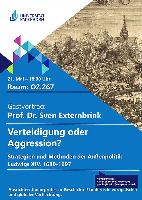 Die Juniorprofessur für die Geschichte Flanderns in europäischer und globaler Verflechtung lädt herzlich zum Gastvortrag von Herrn Professor Sven Externbrink (Universität Heidelberg) ein. Herr Externbrink ist ein Experte bezüglich der Geschichte des französischen Königs Ludwig XIV. und wird im Vortrag spezifisch auf die Reunionspolitik und insgesamt die als aggressiv wahrgenommenen Aspekte der französischen Außenpolitik am Ende des 17. Jahrhunderts eingehen.