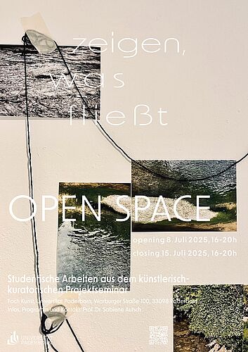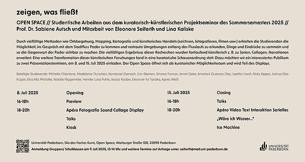 Unter der Thematik „zeigen, was fließt“ wurden der Stadtfluss Pader und das Paderquellgebiet mit dem Fokus auf Wasser fotografisch, filmisch, zeichnerisch und lyrisch erforscht und kuratorisch in eine Schauanordnung übersetzt. Der OPEN SPACE, als Modellraum für das Erproben ästhetischer Prozesse, transformiert auf diese Weise in ein integriertes Display. Wichtige Impulse konnten von den Kuratorinnen des diesjährigen „Tatort Paderborn“ (Der Fluss bin ich) aufgenommen und so das eigene künstlerische Handeln kritisch reflektiert und experimentell erweitert werden.