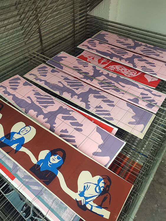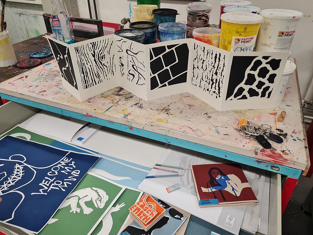 In der Siebdruckwerkstatt stehen Siebe in unterschiedlichen Größen und Gewebefeinheiten, wasserbasierende Farben, Rakel, zwei Siebdrucktische und die technische Ausstattung für die Herstellung von Siebschablonen auf fotochemischen Weg zur Verfügung.