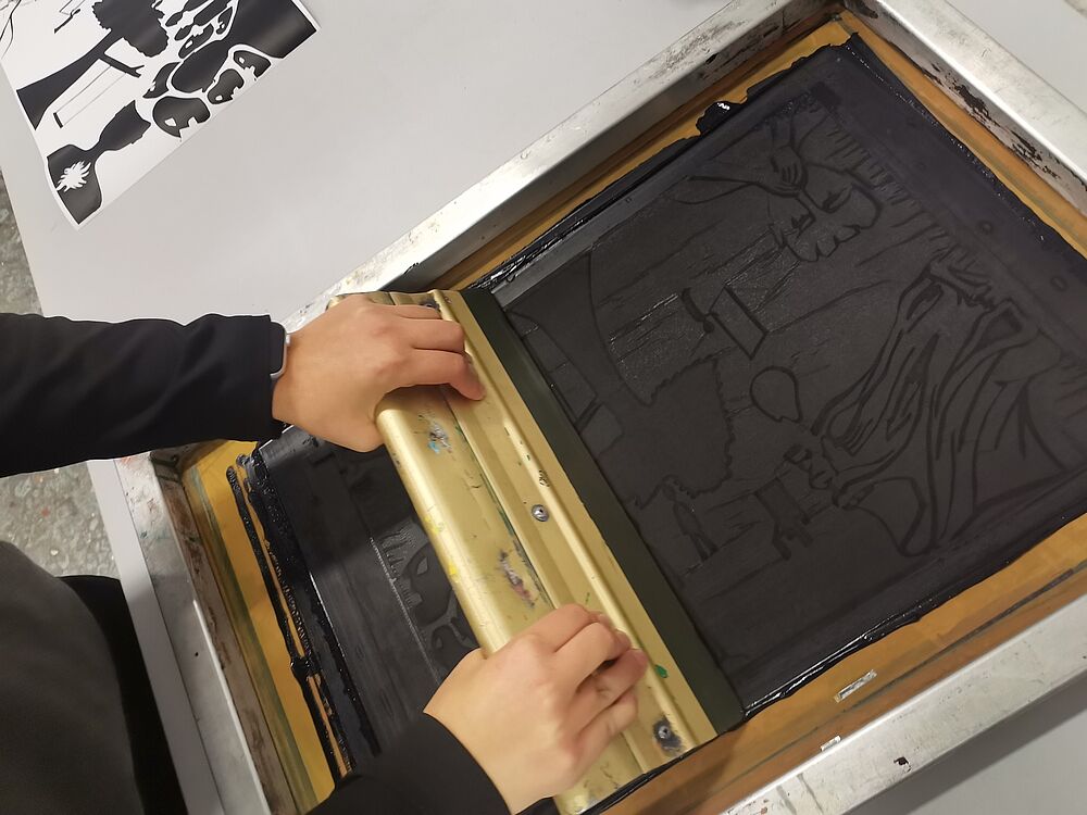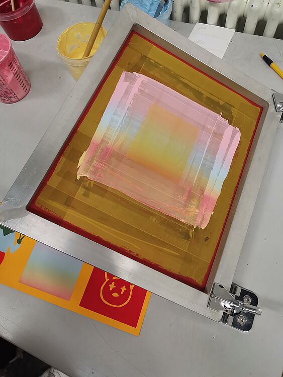Planung und Experiment, Denken und Handeln greifen beim Drucken ineinander. Der Siebdruck steht als druckgrafische Ausdrucksform im Zentrum der Lehrveranstaltungen und Arbeitvorhaben der Studierenden. Durch die Arbeit an eigenständigen Projekten werden die praktischen Fertigkeiten des Siebdrucks vermittelt.
