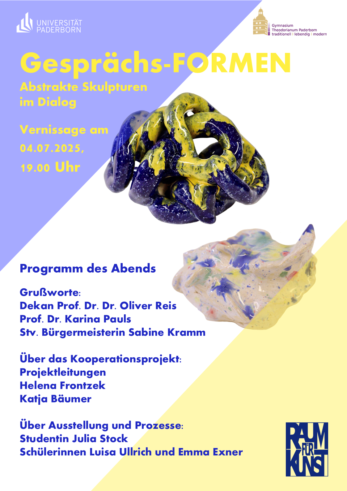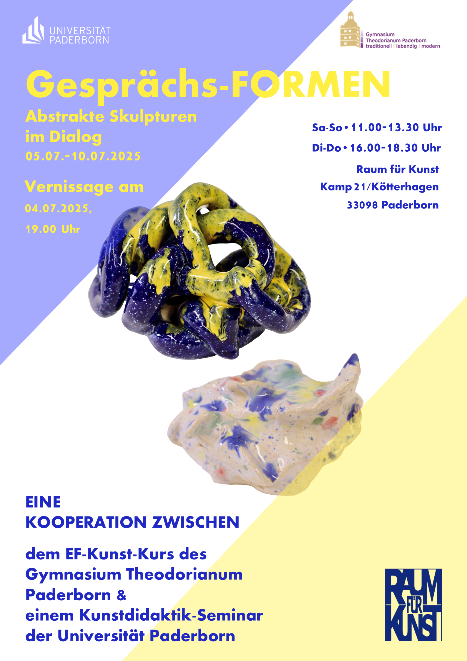 Dabei beschreiben die „Gesprächs-FORMEN“ die Schnittstelle, bei der die Schülerinnen und Schüler in didaktischer Begleitung der Lehramtsstudierenden zu ihrer abstrakten Formensprache gelangen, indem sie räumliche Dialoge zwischen dem wandelbaren Material Ton und einer abstrakten Formgebung erkunden sowie mit keramischer Farbgestaltung experimentieren. Die Ausstellung zeigt die keramischen Skulpturen der Schülerinnen und Schüler, die aus dem künstlerischen Prozess hervorgegangen sind, der von den Studierenden in Unterrichts- und Werkstattgesprächen gestaltet und begleitet wurde.