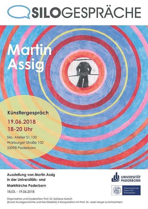 Zum Abschluss seiner Ausstellung kommt Martin Assig auf Einladung von Prof. Meyer zu Schlochtern von der Theologischen Fakultät am Dienstag, 19. 06. 2018 zu einem Austausch mit Studierenden nach Paderborn. Im Rahmen der Silogespräche an der Universität findet um 18.00 Uhr (s.t.) das Künstlergespräch statt (Silo des Faches Kunst, Atelier S.1. 100, Warburger Str. 100); es wird moderiert von Frau Prof. Dr. Sabiene Autsch, Universität Paderborn.