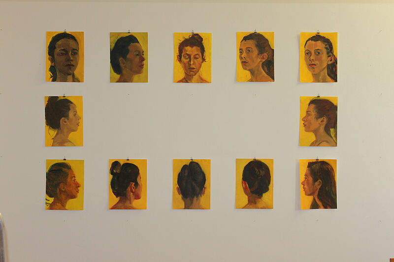 Bei dem ersten handelt es sich um eine Langzeitstudie: Mein Modell - eine Philosophiestudentin - sitzt mir seit einem Jahr regelmäßig. Ich beobachte sie von verschiedenen Ansichten aus und male sie, während wir uns Texte zur Menschheitsgeschichte anhören bzw. sie mir kunsttheoretische und philosophische Texte aus unterschiedlichen Epochen vorliest. Bei diesem Projekt konzentriere ich mich nicht so sehr auf das mimetische Abbilden der vor mir sitzenden Person, sondern ich lenke meine Wahrnehmung darauf, möglichst auf die akustischen und visuellen Reize, die mich während der Sitzung erreichen, mit Farbauftrag und Duktus zu reagieren.