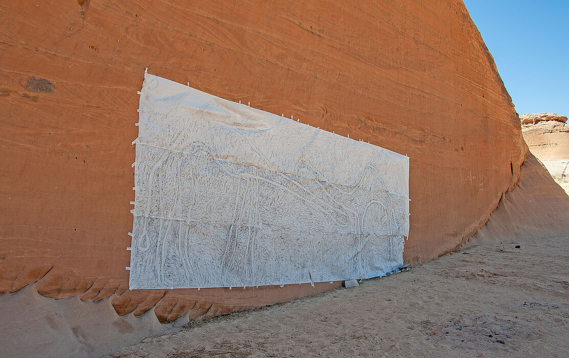 Felsen, Steine und die Zeichnungen, die vor Jahrtausenden von Nomaden und Händlern eingraviert wurden in der Wüste Nefud und am westlichen Ausläufer der Rub al-Chali Wüste auf der arabischen Halbinsel, dominieren meinen Prozess im Atelier. Werke, die in der Zeit vom 19.02 bis 05.04 2020 vor Ort entstanden sind und Material, das ich während der Recherche in der Wüste gesammelt habe. Erfahrungen in diesem weiten und offenen Weltenraum sind für mich wie Bibliotheken unter freiem Himmel oder Räume als kulturelles Gedächtnis. Sie bilden einen Vektor zur Reflexion über Zivilisationen, Klimawandel, Wirtschaftsformen und politischen Modellen. Gleichzeitig regen sie an zum Denken und Imaginieren in neuen Zusammenhängen. Diese umzuformen und im erweiterten Kontext zu visualisieren und in meinem künstlerischen Vokabular einzuordnen, ist Gegenstand der momentanen Auseinandersetzung.