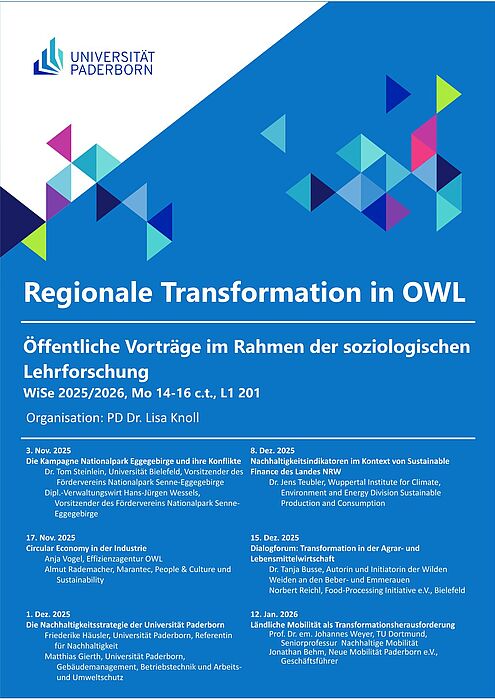 Im Wintersemester 2025/2026 startet die erste Lehrforschung im ZFBA-Soziologie an der UPB. Wir wollen regionale Transformationsprozesse kennenlernen und erforschen. Dazu laden wir Transformationsakteure aus der Region ins Seminar ein, um den Feldzugang für die Studierenden zu erleichtern. Im zweiten Semester bearbeiten die Studierenden eigene Forschungsprojekte, die sie im ersten Semester vorbereiten. Die Vorträge der eingeladenen Transformationsakteure sind öffentlich. Sie können auch von Studierenden und Lehrenden besucht werden, die die Lehrforschung nicht belegen.