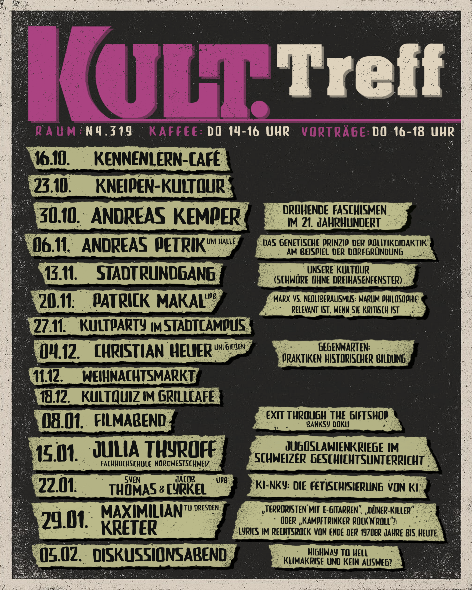 Der Kulttreff ist eine studentische Initiative, die in Kooperation mit dem Geschichtstreffs des Historischen Instituts eine spannende Vortragsreihe für Studierende veranstaltet.