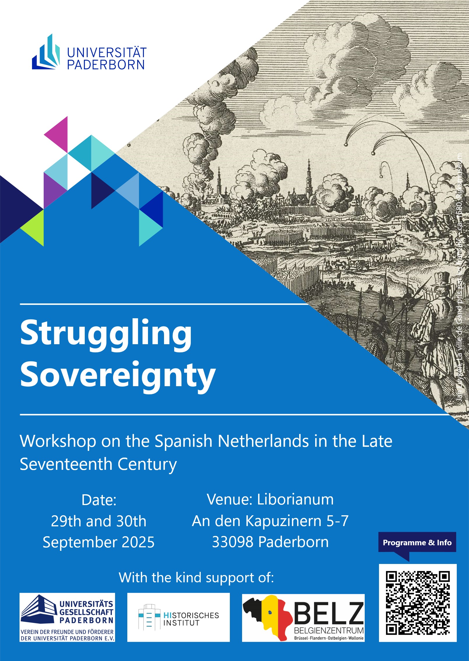 Der Workshop "Struggling Sovereingty - Workshop on the Spanish Netherlands in the Late Seventeenth Century" soll sich dieser Fragestellung widmen: Handelte es sich bei den Spanischen Niederlanden um einen autonomen Staat und welche Handlungsspielräume besaß dieser? Stattfinden wird der Workshop vom 29. bis 30. September 2025 in Paderborn.