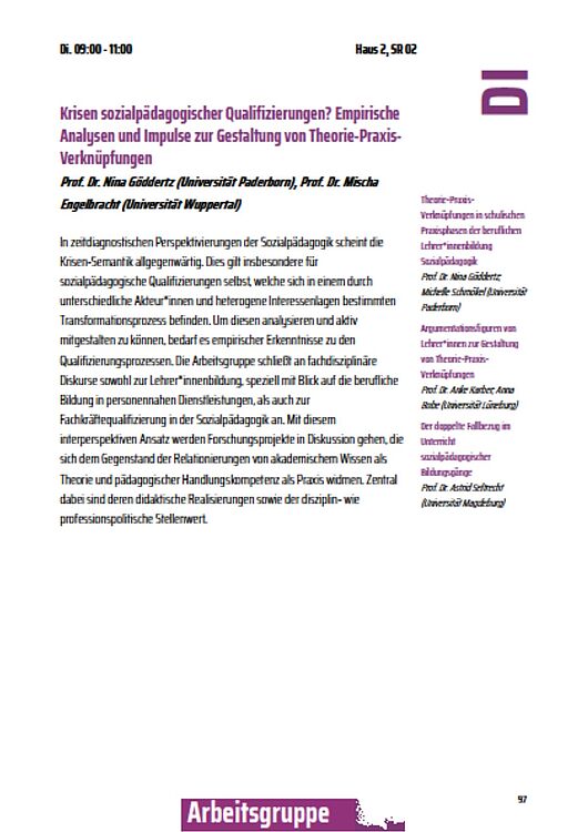 Jun.-Prof’in Dr. Nina Göddertz und Michelle Schmökel haben am 12. März 2024 beim DGfE-Kongress in Halle (Saale) in dem Panel „Krisen sozialpädagogischer Qualifizierungen? Empirische Analysen und Impulse zur Gestaltung von Theorie-Praxis-Verknüpfungen“ einen Beitrag zum Thema „Theorie-Praxis-Verknüpfungen in schulischen Praxisphasen der beruflichen Lehrer*innenbildung Sozialpädagogik“ vorgestellt.