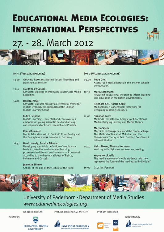 The upcoming Conference “Educational Media Ecologies: International Perspectives”, will be held at the University of Paderborn between 27. - 28. March 2012 at the Facilities of the Department of Media Science. It will be hosted by Dr. Norm Friesen (Thompson Rivers University, Canada), Prof. Dr. Theo Hug (University of Innsbruck, Austria) and Prof. Dr. Dorothee M. Meister (University of Paderborn). The Conference aims the international academic discussion and exchange to a wide range of new perspectives on Educational Media Ecologies.