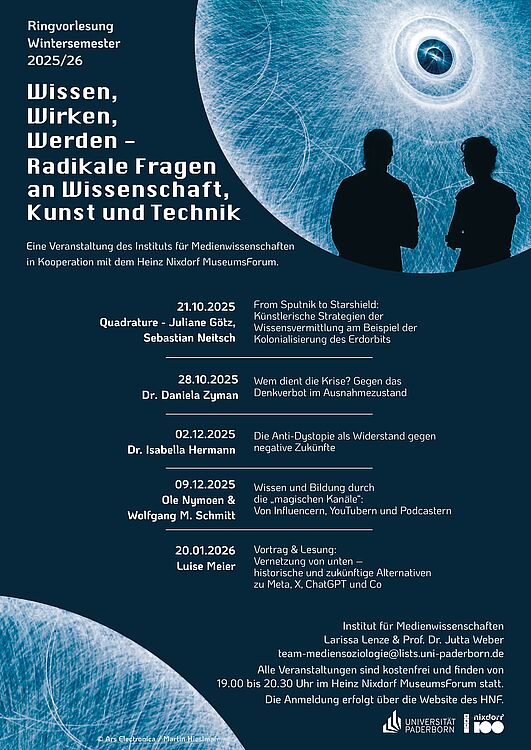 Die Ringvorlesung "Medien | Dystopien" am medienwissenschaftlichen Institut der Universität Paderborn möchte nach dem Verhältnis von Medien(-wissenschaft) und Dystopien fragen. Dafür soll in einem ersten Schritt nach der Mediengeschichte der Dystopie selbst und damit der Historizität dystopischer Narrative gefragt werden: Wie erklären sich beispielsweise bestimmte Konjunkturen dystopischer Narrative? In einem zweiten Schritt wendet sich der Blick auf aktuelle Debatten und ihre dystopischen Entwürfe in Kontexten von Überwachung und Kontrolle, künstlicher Intelligenz oder auch des Human Enhancement. In einem letzten Schritt schließlich soll die Theoriebildung selbst Gegenstand werden, fußen theoretische Beschreibungen wie das Anthropozän, die Gaia-Hypothese oder auch die Dark Ecology oft auf einem dystopischen Weltbild.