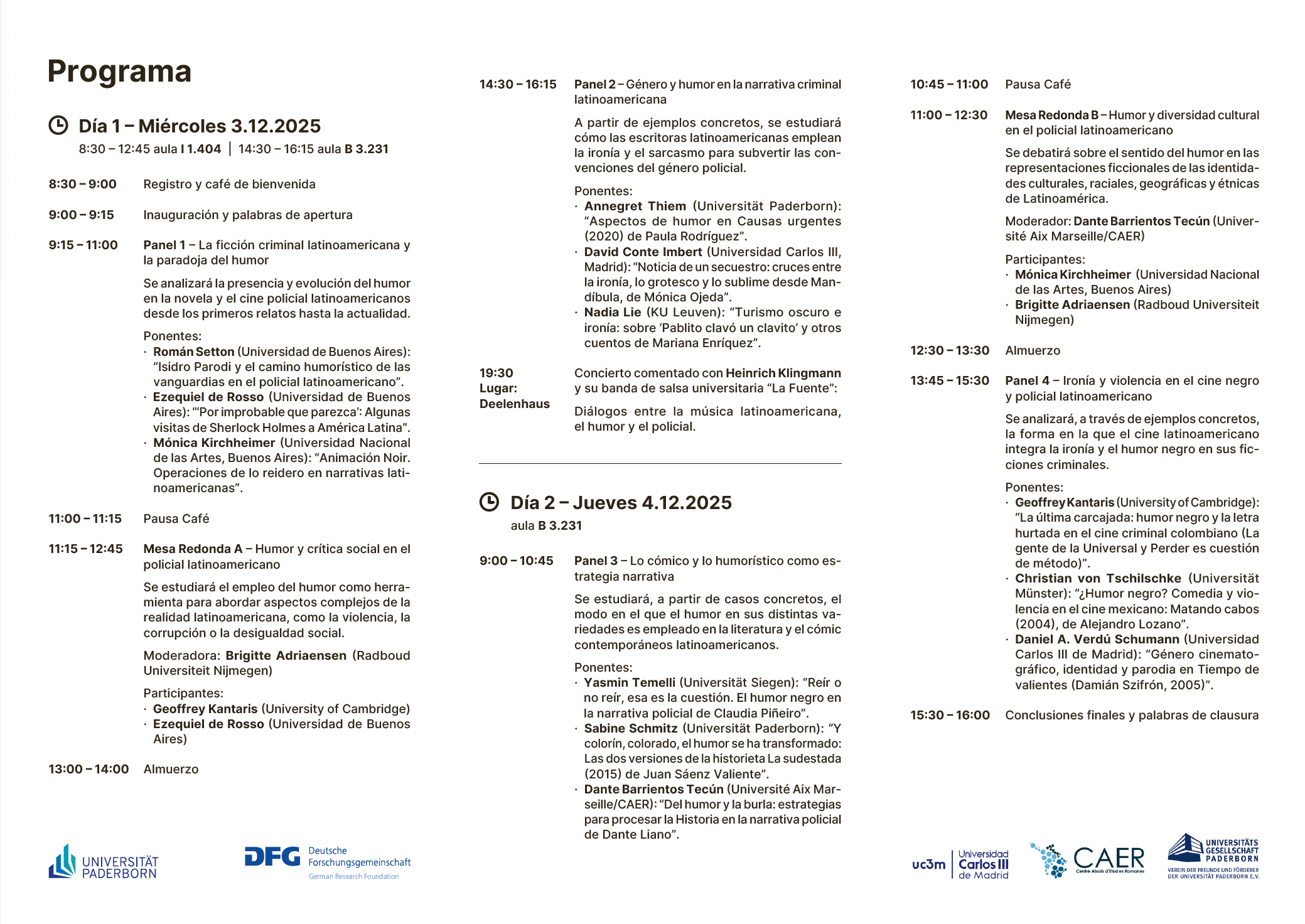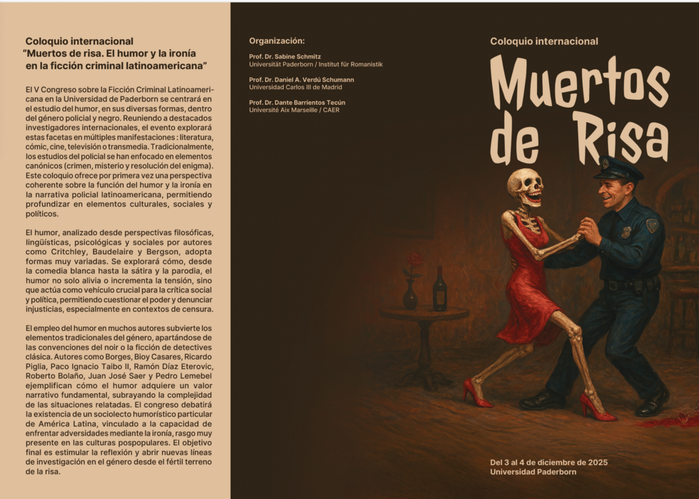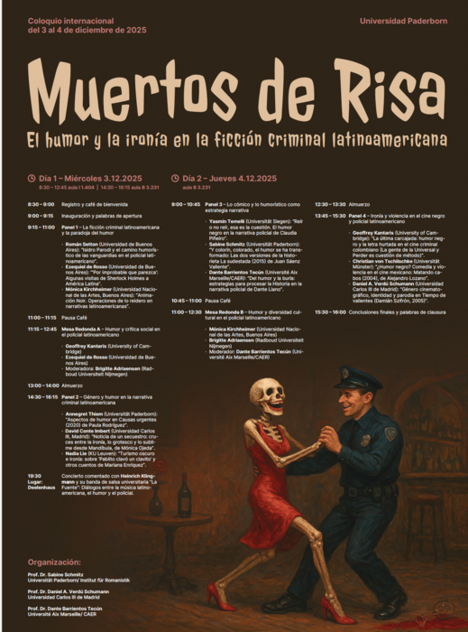 Auf der nun schon 5. Konferenz zum lateinamerikanischen Krimi an der Universität Paderborn geht es um eine spannende Seite des lateinamerikanischen Krimis, die bisher von der Forschung nicht beleuchtet wurde: Humor und Ironie. Diese Elemente sichern nicht nur den Unterhaltungswert der Gattung, sondern spielen eine wichtige Rolle, um gesellschaftliche Missstände, Machtstrukturen und kulturelle Vielfalt sichtbar zu machen. Die Veranstaltung zeigt, wie lateinamerikanische Autoren, Filmemacher und Comickünstler Humor und Ironie nutzen, um kritische Themen anzusprechen, Tabus zu brechen und gesellschaftlichen Wandel anzustoßen. Hierzu werden Krimierzählungen von hochkarätigen Wissenschaftlern aus sieben Ländern in medialen Formaten wie Literatur, Comic, Animationsfilmen und ‚klassischen‘ Kinofilmen in kultur-, literatur- und medientheoretischer Perspektive in der Rahmung des Krimis als Bestandteil populärer (Medien-)Kulturen in Lateinamerika betrachtet. Erst auf dieser Grundlage eröffnet sich in der Diskussion ein neuer Blick auf die aktuellen hybriden Kulturprozesse in Lateinamerika, der einerseits den globalisierten Dialog der Kulturen und andererseits lokalen und regionalen, insbesondere indigenen, Beiträgen zur Ausgestaltung aktueller postpopulärer Kulturen Rechnung trägt.