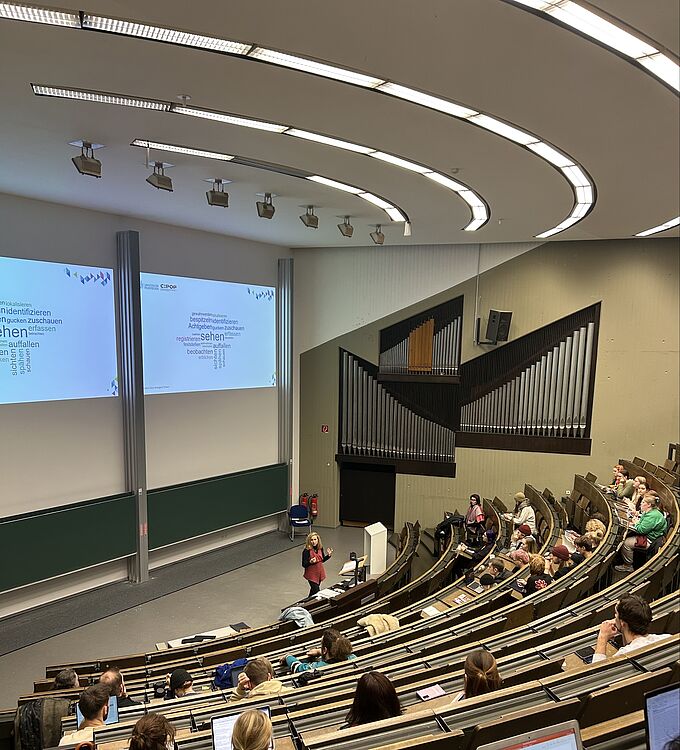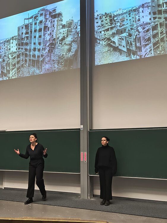 Am 3. Dezember 2024 regte Prof.in Dr.in Annegret Thiem mit ihrem Vortrag „Im Angesicht des Konflikts: Ver:achtsamkeit und die Lust des Sehens“ zum Nachdenken an. Dabei setzte sie sich mit der Frage auseinander, inwieweit Fotograf:innen und Medien das Recht zugesprochen werden sollte, Leid in Form von Bildern sichtbar zu machen und zu verbreiten. Untermalt wurde ihr Impuls durch die Performance zweier Studentinnen (Tatiane Hoffmann, Greta Gerdes), die die Perspektive der Opfer und Fotografierten repräsentierte. Rückblickenden fasst Prof.in Dr.in Thiem ihre Überlegungen wie folgt zusammen: