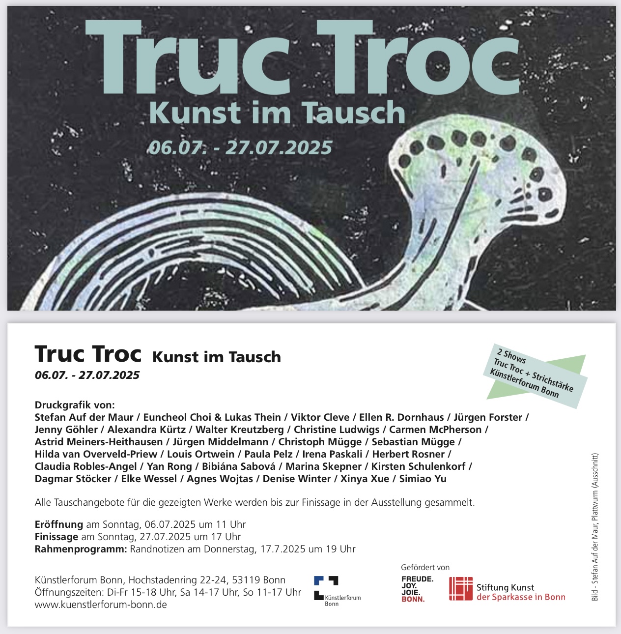 Zur Ausstellung wurde in einem open call deutschlandweit ausgeschrieben. Die Idee hinter "Truc Troc- Kunst im Tausch" ist die Zugänglichkeit zur Kunst für alle Menschen zu fördern und den kreativen Prozess zu erweitern. Der Fokus liegt dabei auf Druckgrafik. Ein umfangreiches Programm ergänzt die Ausstellung.