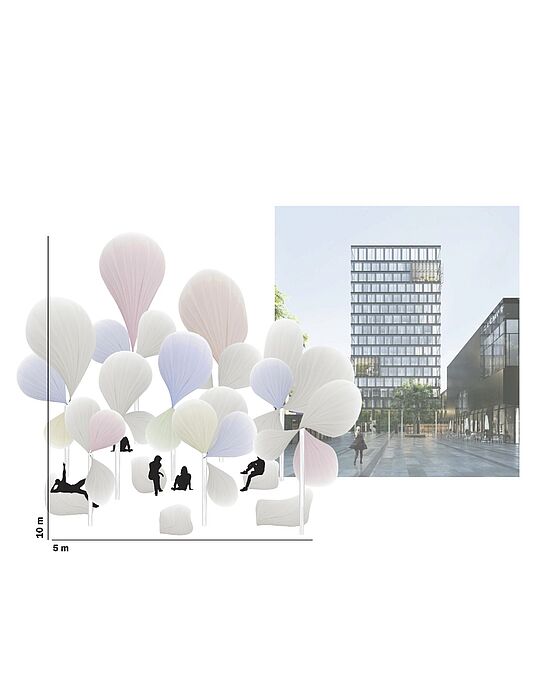 Mit ihrer Installation „Atmosphären der Wissenschaft“ wollten Kürtz, Detmar und Pallas die unsichtbare Dynamik der Atmosphäre sichtbar machen. Wetterballons, symbolisch für die 27 europäischen Länder, sollten mithilfe von Echtzeit-Wetterdaten ihre Farben verändern und so die Vielfalt meteorologischer Prozesse erlebbar machen. Durch den Einsatz robuster, langlebiger Materialien wie Cordura und Kevlar sowie energieeffizienter LED-Technik verband der Entwurf künstlerische Aussagekraft mit einem klaren Bekenntnis zur Nachhaltigkeit. Ergänzend waren organisch geformte Sitzobjekte vorgesehen, die Besucher*innen zur direkten Interaktion und Reflexion einladen.