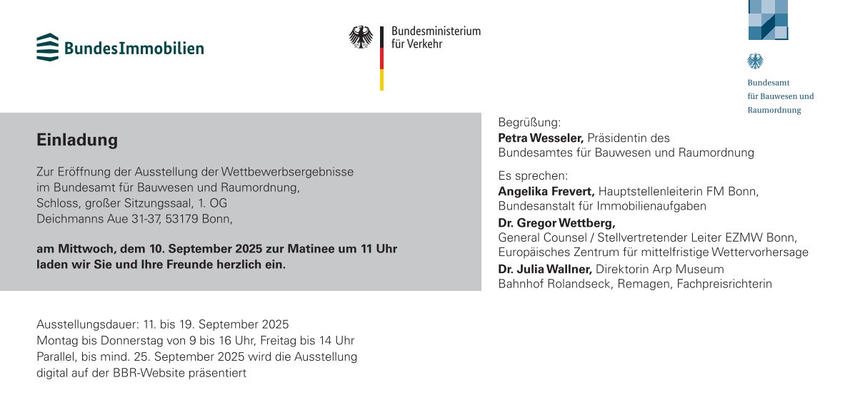 Am Mittwoch, den 10. September 2025, eröffnet um 11 Uhr die Finalist*innenausstellung des internationalen Wettbewerbs Kunst am Bau (EZMW). Ausgeschrieben wurde dieser vom Bundesamt für Bauwesen und Raumordnung (BBR) in Berlin. Der oder die Erstplatzierte erhält die Möglichkeit, ein Projekt mit einem Budget von einer halben Million Euro zu realisieren.