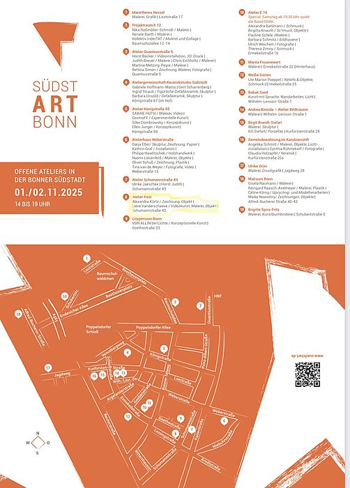 Insgesamt öffnen 19 Ateliers mit 48 Künstler*innen ihre Türen im größten zusammenhängenden Gründerzeitviertel Deutschlands, das zu einem Spaziergang von Atelier zu Atelier einlädt. Es ist in fünf Minuten Fußweg vom Bonner Hauptbahnhof zu erreichen und gesäumt von vielen Cafés und Restaurants.