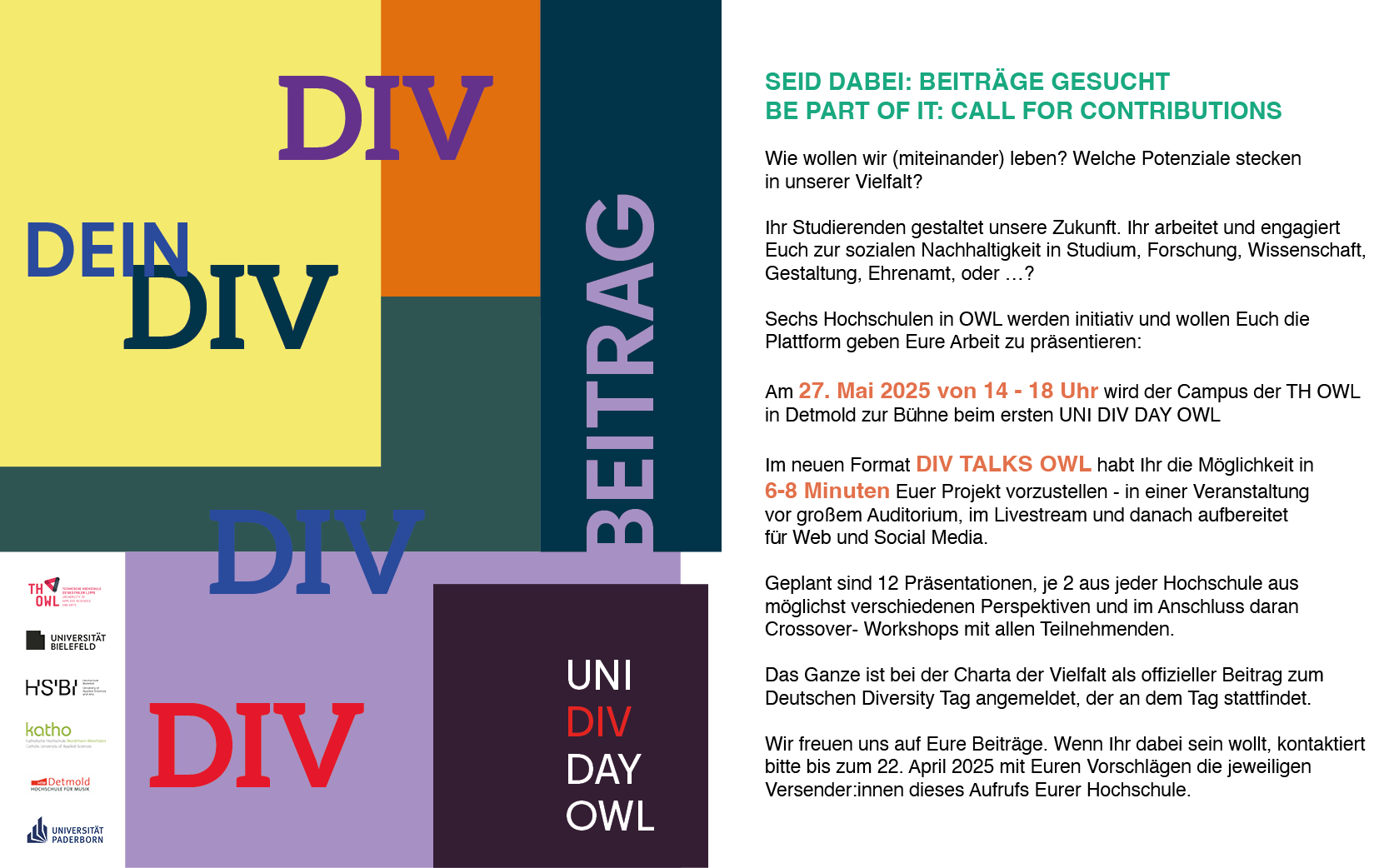 Im Format “DIV TALKS OWL” bekommen Studierende die Möglichkeit, ihre nachhaltigen, sozialen und diversen Projekte und Arbeiten vor einem großen Publikum vorzustellen. Bei Interesse kann sich bis zum 22. April an Laura Maring, Referentin für Diversity an der Universität Paderborn (laura.maring@uni-paderborn.de) gewandt werden.