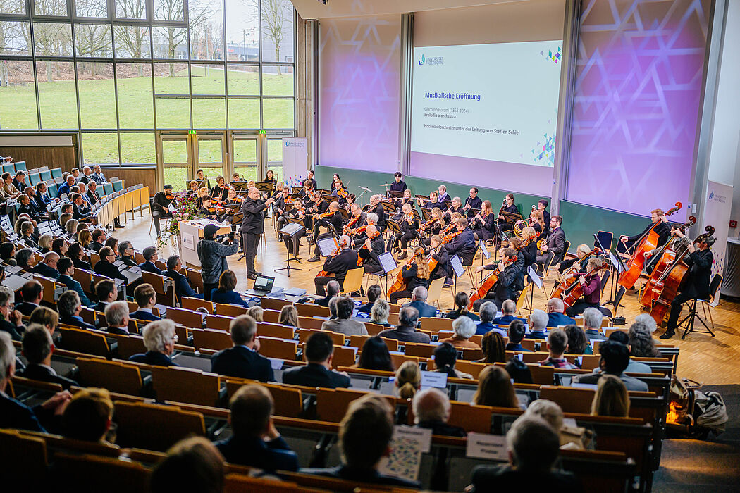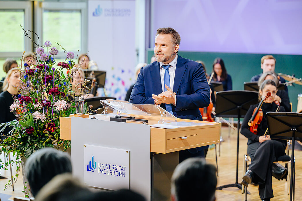 Am Sonntag, 18. Januar, hat die Universität Paderborn ihren traditionellen Neujahrsempfang mit rund 400 Gästen aus Wissenschaft, Wirtschaft und Politik im Auditorium maximum gefeiert. Prof. Dr. Matthias Bauer, Präsident der Universität, begrüßte die Anwesenden zum ersten feierlichen Jahresauftakt des neuen Präsidiums.