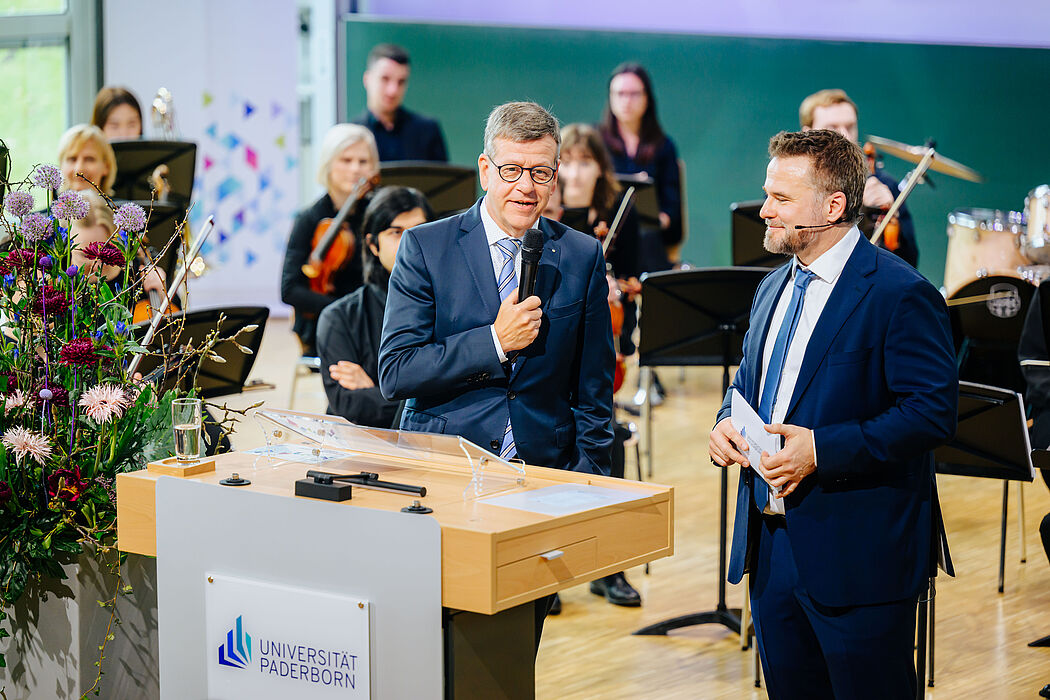 Nach seiner Ansprache wechselte Prof. Bauer, in Vertretung für den erkrankten Ulrich Lettermann, von der Rolle des Gastgebers in die des Moderators der Veranstaltung. In einem kurzen Interview mit Prof. Dr. Andreas Siebe, Vorsitzender der Universitätsgesellschaft, ging es um die Aufgaben und das Engagement von Freund*innen und Förder*innen der Universität. Neben den jährlich verliehenen Preisen an hervorragende Studierende setzt sich der Förderverein für Nachwuchswissenschaftler*innen und Studierendenaktivitäten ein. Sein Wunsch sei es, das Engagement in diesem Jahr weiter zu verstärken.