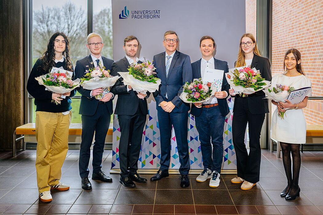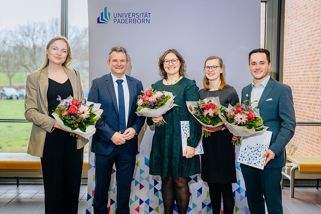 Fünf Absolvent*innen aus allen Fakultäten der Universität Paderborn durften sich über ein Preisgeld von jeweils 1.000 Euro freuen. Die Universitätsgesellschaft honorierte Rose Sunil, Luca Maurice Jotzo, Paul Steinmeier, Niklas Lamberty und Nicole Grieger für ihre ausgezeichneten Masterarbeiten. Hasna Mahmoud erhielt den Preis der Universitätsgesellschaft für internationale Studierende mit besonderen fachlichen Leistungen und großem sozialen Engagement. Der Förderpreis des DAAD für internationale Studierende ging an Lakshay Khanna. Dieser Preis wird jährlich einmal pro Hochschule vergeben.