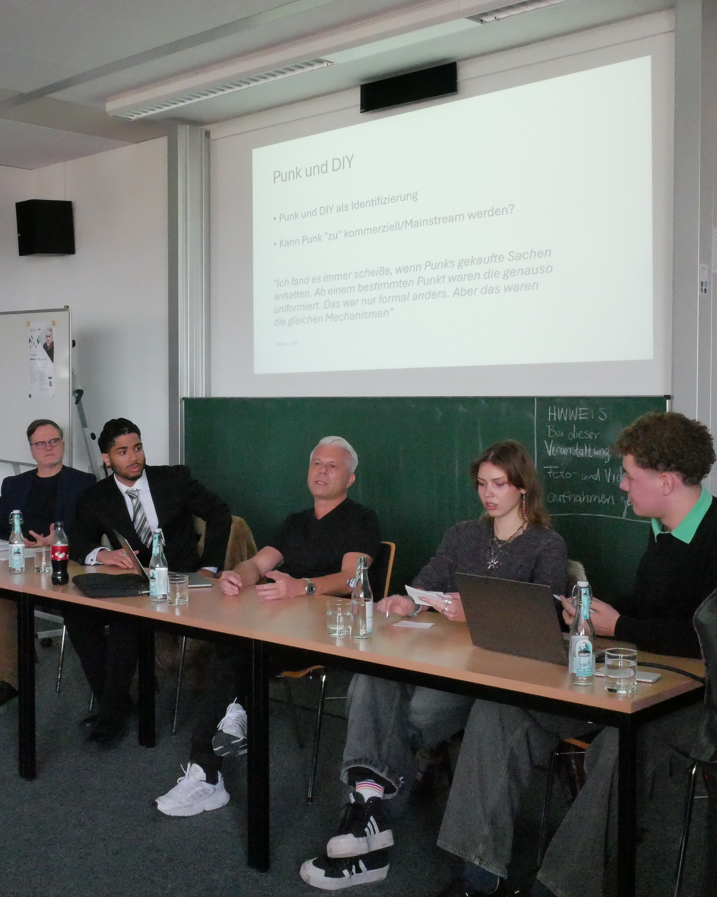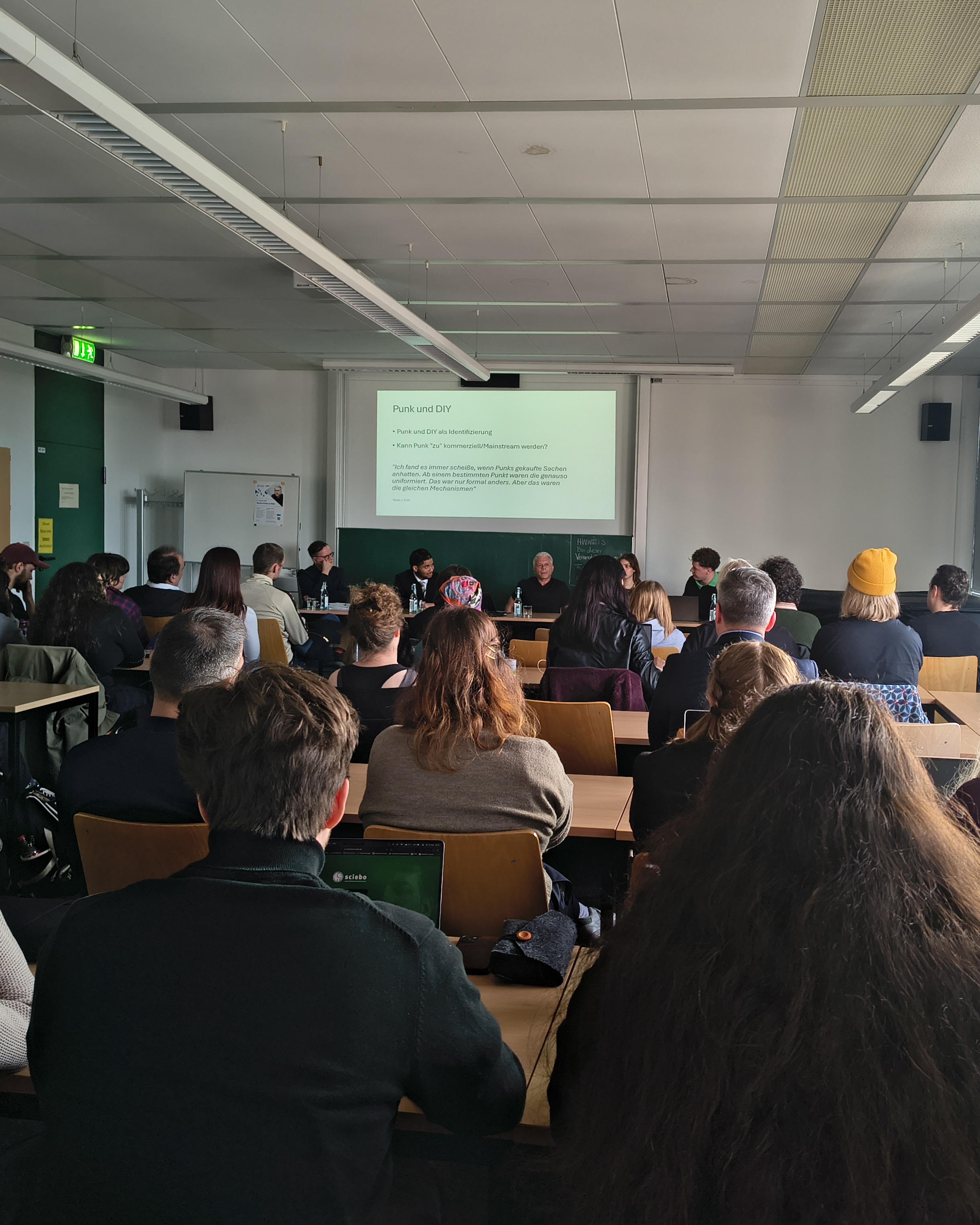 Die Podiumsdiskussion wurde durch die Studierenden des Seminars von Prof. Jacke angeleitet und moderiert. Nach einem kurzen Einstieg über die Seminarinhalte wurde dem Gast aus Berlin direkt die erste Frage gestellt: Wie weit geht Punk?