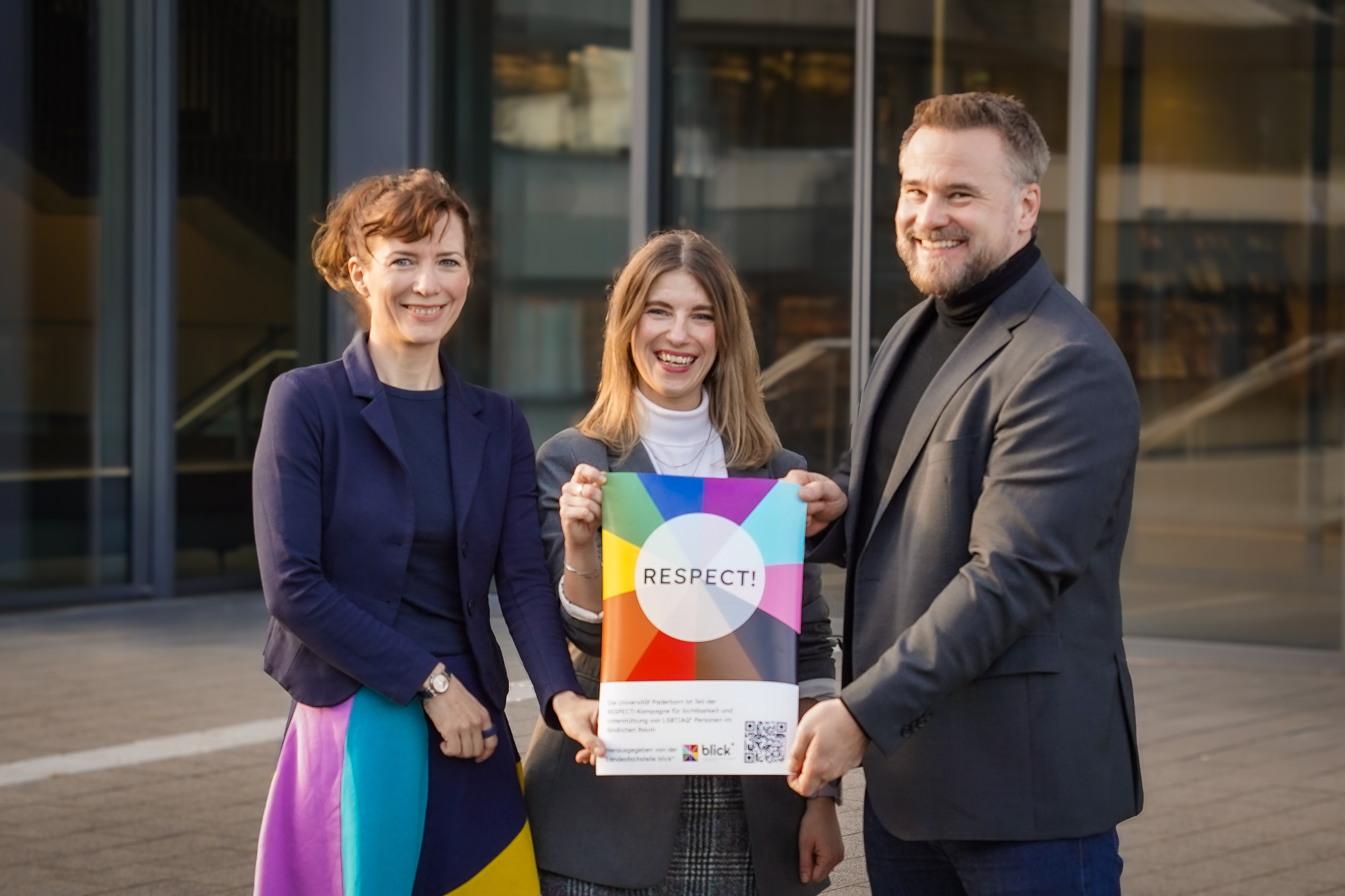 „Als Universität möchten wir nicht nur exzellent in Forschung und Lehre sein, sondern auch exzellente Bedingungen für eine demokratische, offene und inklusive Gesellschaft bieten. Der Beitritt zur Kampagne der Landesfachstelle blick* unterstreicht unseren Anspruch, eine Einrichtung zu sein, an der Diversität und gegenseitige Unterstützung gelebte Realität sind“, erklärt Universitätspräsident Prof. Dr. Matthias Bauer. Die Landesfachstelle blick* setzt im ländlichen Raum breitflächig Impulse zu den Themen sexuelle und geschlechtliche Identität. Mit der „RESPECT!-Kampagne“ will sie mehr Sichtbarkeit für lesbische, schwule, bisexuelle, trans*, inter* und queere Personen schaffen. Die Sticker und Plakate, die mittlerweile an vielen Eingängen unterschiedlicher Institutionen angebracht sind, signalisieren: Hier ist ein offener Ort, an dem alle Menschen willkommen sind.
