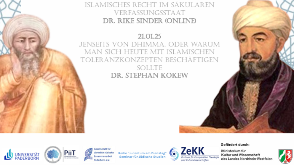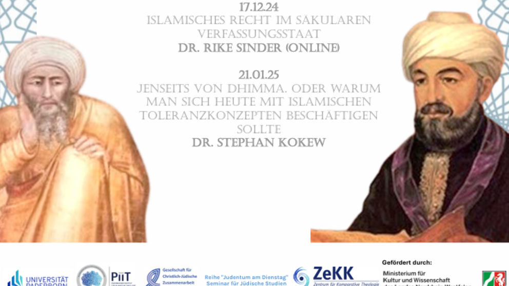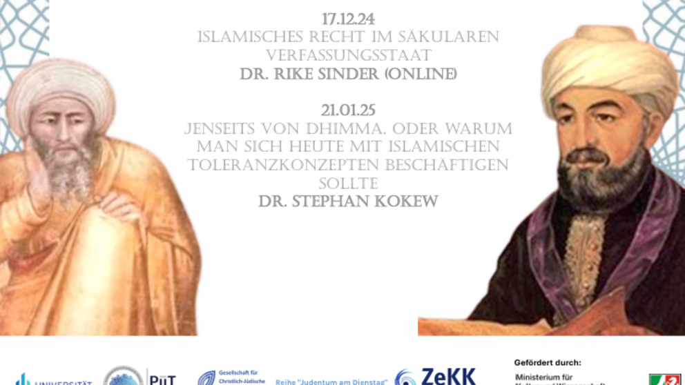 Im Rahmen der Ringvorlesung "Rechtsdenken im Gespräch. Jüdische und Islamische Rechtstraditionen im Kontext von Rechtsstaatlichkeit und Demokratie" hält Dr. Stephan Kokew am 21.01.2025 einen Vortrag mit dem Titel "Jenseits von Dhimma. Oder Warum man sich heute mit Islamischen Toleranzkonzepten beschäftigen sollte".