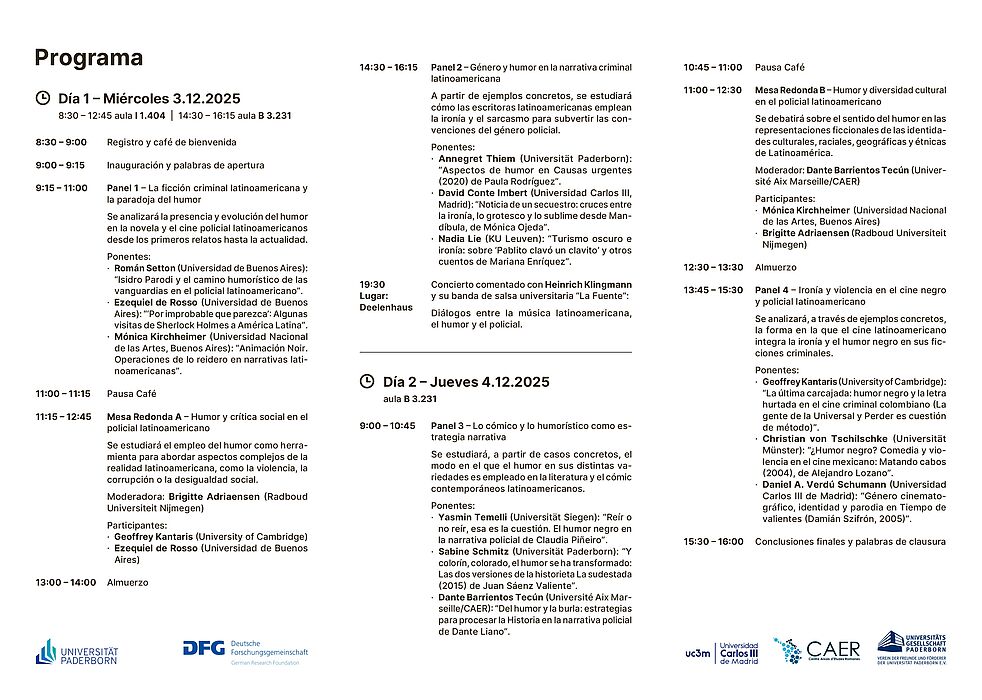 Am 3. und 4. Dezember findet an der Universität Paderborn eine internationale Tagung zum Thema „Muertos de risa. El humor y la ironía en la ficción criminal latinoamericana" statt. Bei der Veranstaltung wird untersucht, wie lateinamerikanische Autor*innen, Filmemacher*innen und Comickünstler*innen Humor nutzen, um kritische Themen anzusprechen, Tabus zu brechen und gesellschaftlichen Wandel anzustoßen. Die Tagung findet in den Räumen I 1.404 und B 3.231 statt. Eine Anmeldung ist per Mail an resul.karaca@uni-paderborn.de möglich, alle Vorträge finden auf Spanisch statt.