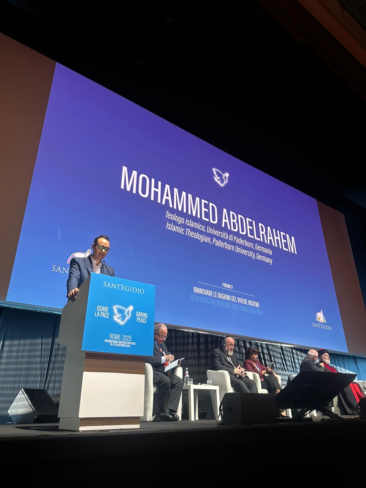 Vom 26. bis 28. Oktober 2025 nahm Dr. Mohammed Abdelrahem, wiss. Mitarbeiter am Institut für Islamische Theologie und Zentrum für Komparative Theologie und Kulturwissenschaft (ZeKK), am internationalen Friedensforum „Daring Peace“ der Gemeinschaft Sant’Egidio in Rom teil. Unter dem Leitgedanken „Frieden wagen“ versammelten sich religiöse und politische Führungspersönlichkeiten sowie Intellektuelle aus aller Welt, um Wege des Dialogs und des Zusammenlebens zu erörtern. Im Rahmen des Forum 17 zum Thema „Renewing the Reasons for Living Together“ entwickelte Mohammed Abdelrahem eine interessante Perspektive auf das Verhältnis von Einheit und Vielfalt. Anhand der „Khutbat al-Wada‘“ (Die Abschiedspredigt) des Propheten Muhammad (s) zeigte er auf, wie der monotheistische Glaube an einen Gott nicht zur Uniformität, sondern zu einer theologisch begründeten Anerkennung von Pluralismus führen kann. Seinen Vortrag „Die Abschiedspredigt als theologische Grundlage für gemeinsame Vielfalt“ hielt er in prominenter Runde unter Moderation von Erzbischof Vincenzo Paglia. Weitere Teilnehmer der Podiumsdiskussion waren Kardinal Jean-Claude Hollerich, Oberrabbiner Ephraim Mirvis, Patriarch Mar Awa Royel, Kulturminister Ghassan Salamé, Ram Madhav von der India Foundation sowie Philosophin Donatella Di Cesare. Im Anschluss an das Forum vertiefte Abdelrahem seine Thesen in einem Interview mit Radio Vatikan, in dem er die Bedeutung des Dialogs zwischen den Religionen für die Bewältigung gegenwärtiger gesellschaftlicher Herausforderungen betonte. Die aktive Teilnahme von Mohammed Abdelrahem an diesem bedeutenden globalen Dialog unterstreicht die relevante Rolle einer zeitgemäßen islamischen Theologie, die konstruktiv zu den drängenden Fragen des friedlichen Zusammenlebens in unserer Welt beiträgt.