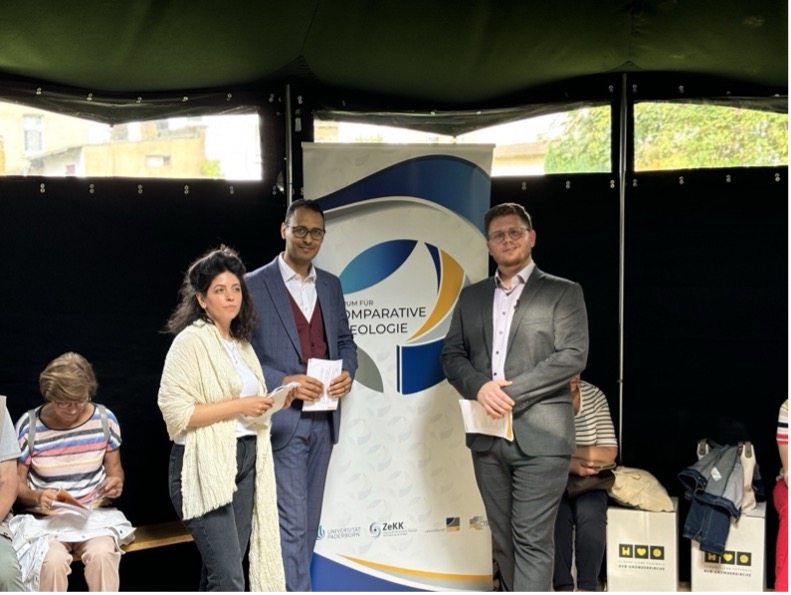 Am Donnerstag, dem 22. August 2024, fand in der BVB-Gründerkirche ein bewegender Moment der interreligiösen Begegnung statt. Das Team des Zentrums für Komparative Theologie Paderborn organisierte gemeinsam mit der Kirche ein multireligiöses Friedensgebet, um die offizielle Eröffnung des Welcome-Zelts, auch „Kumm-rin!“ genannt, zu feiern. Yael Attia, Domenik Ackermann und Mohammed Abdelrahem, Mitarbeiter*innen des ZeKK und des Forums für Komparative Theologie, trugen als Vertreter der drei abrahamischen Religionen ausgewählte Texte aus der Tora, dem Neuen Testament und dem Koran vor. Gemeinsam mit den Gästen und dem ukrainischen Chor vor Ort sangen sie auch das Lied „Hine Ma Tov“, ein eindrucksvolles Zeichen der Verbundenheit und des gemeinsamen Engagements für Frieden und Toleranz. Im Anschluss an das Gebet nutzte das ZeKK-Team die Gelegenheit, um über die Bedeutung des Welcome-Zelts und die zentrale Rolle der Gastfreundschaft Gottes zu reflektieren. Die Botschaft war klar: Das Zelt soll ein Ort der Begegnung, des Dialogs und der gegenseitigen Wertschätzung sein. Die gelungene Veranstaltung unterstreicht das Engagement aller Beteiligten für ein friedliches Miteinander. Das Welcome-Zelt bietet nun einen Raum, um diese interreligiösen Begegnungen fortzuführen und zu vertiefen.